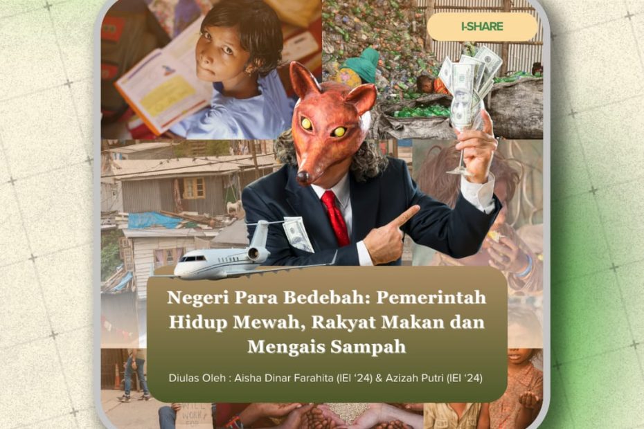 Aisha Dinar Farahita (IEI ‘24) , Azizah Putri Mardhiyah (IEI ‘24)  لَا يَكُونَ دُولَةًۢ بَيْنَ ٱلْأَغْنِيَآءِ مِنكُمْ “Supaya harta itu jangan beredar di antara orang-orang kaya saja di antara kamu.” Q.S. Al-Hasyr ayat 7 Gaya hidup mewah merujuk kepada kebiasaan mengonsumsi barang yang eksklusif, di… Read More »Negeri Para Bedebah: Pemerintah Hidup Mewah, Rakyat Makan dan Mengais Sampah