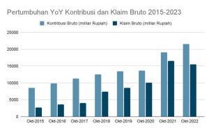Diagram di samping menunjukkan jumlah kontribusi bruto (premi) dan klaim bruto (oleh peserta) dalam kurun waktu 8 tahun yaitu 2015 – 2022.