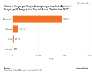 Erlina, F. S. (2023, Desember 05). Sebaran Pengungsi Tanpa Kewarganegaraan dari Myanmar/Pengungsi Rohingya dan Pencari Suaka (September 2023). Katadata.co.id. Retrieved January 10, 2024, from https://databoks.katadata.co.id/datapublish/2023/12/05/bangladesh-hingga-indonesia-jadi-suaka-bagi-pengungsi-rohingya#:~:text=Rombongan%20Rohingya%20paling%20banyak%20mengungsi,sebesar%2022.110%20orang%20atau%202%25.