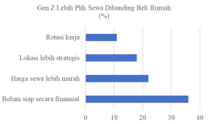 Belakangan ini ramai diperbincangkan di media sosial mengenai preferensi Gen Z yang lebih banyak memilih untuk menyewa dibandingkan membeli rumah. Berdasarkan survey aplikasi Jakpat, mayoritas Gen Z sebesar 36% memilih untuk menyewa atau mengontrak ketimbang membeli rumah dengan alasan belum matang secara finansial untuk bisa membeli rumah atau properti pribadi. Selain terhalang isu finansial, 22% responden memilih untuk menyewa karena harganya lebih murah, 18% karena lokasinya yang strategis, dan 11% karena adanya aturan rotasi kerja. Direktur Research and Consultancy Savills, mengungkapkan bahwa ketidakinginan Gen Z membeli rumah didasarkan pada harga properti yang terlalu mahal dan penghasilan yang masih pas-pasan. Sehingga dengan gaji yang pas-pasan membuat Gen Z menganggap masih banyak keperluan lain yang harus dipenuhi sehari-hari, yang menyebabkan tidak mampu untuk membayar DP maupun cicilan KPR.